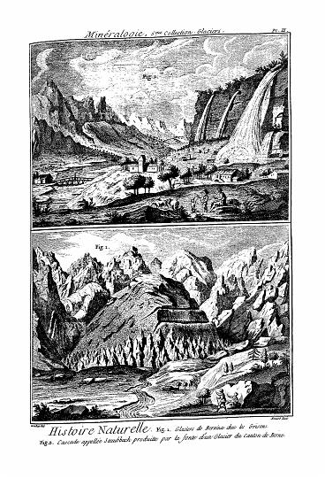 La situation en est très-agréable ; on voit d'un côté le lac, de l'autre le Rhône, aux environs une campagne riante, des coteaux couverts de maisons de campagne le long du lac, et à quelques lieues les sommets toujours glacés des Alpes, qui paraissent des montagnes d'argent lorsqu'ils sont éclairés par le soleil dans les beaux jours. Le port de Genève sur le lac avec des jetées, ses barques, ses marchés, etc. et sa position entre la France, l'Italie et l'Allemagne, la rendent industrieuse, riche et commerçante. Elle a plusieurs beaux édifices et des promenades agréables ; les rues sont éclairées la nuit, et l'on a construit sur le Rhône une machine à pompes fort simple, qui fournit de l'eau jusqu'aux quartiers les plus élevés, à cent pieds de haut. Le lac est d'environ dix-huit lieues de long, et de quatre à cinq dans sa plus grande largeur. C'est une espèce de petite mer qui a ses tempêtes, et qui produit d'autres phénomènes curieux. Voyez TROMBE, SEICHE, etc. et l'hist. de l'acad. des Sciences des années 1741 et 1742. La latitude de Genève est de 46d. 12'. sa longitude de 23d. 45'.