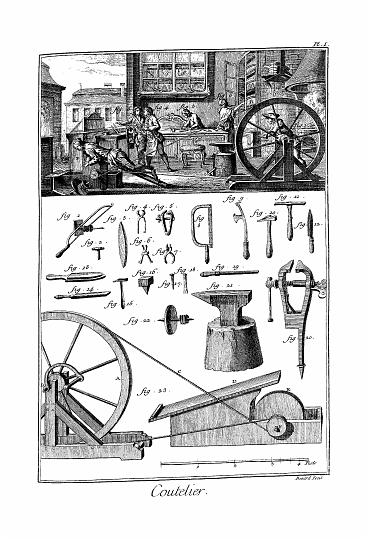 Nous prenons pour émoudre le rasoir une meule d'environ quinze pouces, montée sur un arbre de fer d'environ un pouce en carré, sur dix-huit pouces de long ou environ, selon la commodité des lieux. Nous émoulons le rasoir ; nous dressons le tranchant et les biseaux ; nous formons le dos et le talon, et c'est ce que nous appelons blanchir.