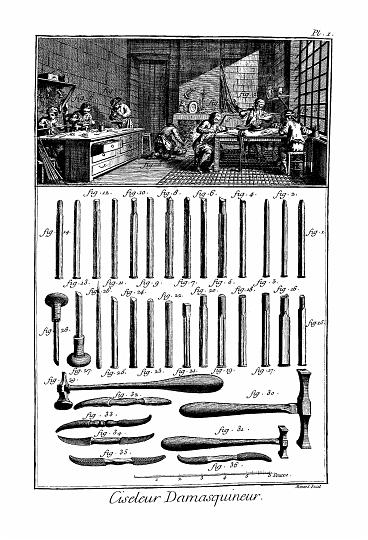* FRAISOIR, (Lutherie) c'est le même que celui des autres ouvriers en fer ; il sert aussi à élargir l'entrée d'un trou où l'on veut noyer un clou, une vis. Il y en a de carrés, d'autres à un plus grand nombre de pans, de cannelés, de taillés en lime, etc. celui qui se termine en cône, soit qu'il soit à facettes, soit qu'il ait été taillé en lime, s'appelle fraisoir à têtes perdues ; il est monté sur une boite, comme le foret ; et l'on s'en sert à l'arson et à la palette, ainsi que du foret. Voyez l'article FORET.