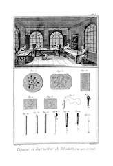 Quand ce sont des boites guillochées à-plat, on ne met point de mordant, mais les couleurs à deux ou trois couches ; après quoi, trois à quatre couches de vernis blanc ; il faut prendre garde que le feu des fours soit bien modéré, de crainte que le vernis ne gerse.