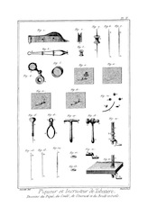 Après cela, je fais sur ces traits qui déterminent les vives-arêtes, autant de traits de parallèles qui servent de tenons aux précédents ; car il est évident que quand on fera la coulisse, les premiers traits disparaitront. Pour faire les cent quatre-vingt coulisses, on commence par enlever les angles ; pour évider le reste, on a des échopes à coulisses. Ce sont des espèces de burins qui ont la courbure même du charnon sur leur partie tranchante. On enlève avec cet outil la matière, et l'on acheve la coulisse ; pour la dresser on a des limes à coulisses. Ce sont des limes cylindres, rondes, du diamètre de la coulisse, ou un peu plus petit, afin que le charnon ne porte que sur les bords de la coulisse. Avant que de souder les charnons, on s'assure que la coulisse est droite au fond par le moyen d'une petite règle tranchante, que l'on pose par-tout, et sur toute la longueur. Il faut que le nombre des charnons soit impair, afin que les charnons des deux bouts qu'on laisse plus longs que les autres, à discrétion, soient tous deux soudés en-haut. On enfîle tous les charnons dans un fil de fer, on pose les deux coulisses l'une sur l'autre, et on y place les charnons ; et l'on marque avec un compas sur les porte-charnières d'en-haut, la longueur des charnons des deux bouts, ou maîtres charnons ; puis avec une pointe on marque au-dessus et au-dessous sur les porte-charnières, les places de tous les charnons. On désassemble le tout, puis dans les coulisses, partout où il doit y avoir un charnon soudé, on donne 2 ou 3 traits de burin transversalement pour donner de l'air à la soudure. On remet les charnons enfilés dans la coulisse du dessous ; on commence par lier les deux charnons du bout avec du fil de fer, puis les autres alternativement. Ensuite on retire le fil de fer passé dans les charnons, et tous les charnons de la coulisse d'en-bas tombent. On les reprend, et on les place et lie dans les intervalles de la coulisse d'en-bas, qui leur ont été marqués par la pointe à tracer, et les coups de burin transversals. Cela fait, on tient avec une pince à charnon, les charnons, et on les range selon l'assemblage marqué par les traits du burin donnés fort sur les bouts, dans le milieu des coulisses ; on commence par faire le couvercle sur la cuvette par le devant, et l'on abaisse les coulisses l'une vers l'autre, jusqu'à ce que les charnons se touchent ; puis avec une pointe on les fait engager les uns entre les autres, puis on pose un des maîtres charnons sur une enclumot perpendiculairement, et l'on frappe sur l'autre maître charnon avec un petit marteau, pour les serrer tous les uns contre les autres : en observant de se régler sur les traits de compas faits au-dessus qui déterminent la longueur des maîtres charnons. On voit bien qu'il y a entre chaque charnon et la coulisse opposée, l'intervalle au-moins du fil de fer ; on frotte les fils de fer de sel de verre, pour empêcher la soudure de s'y attacher, puis on les soude ou ensemble, ou séparément. Si ensemble, on sépare beaucoup les coulisses ; si séparément, on commence par rocher avec une eau de borax, le dedans de la coulisse. On charge les charnons de soudure, coupée par paillons, qu'on ne met que d'un côté ; on roche d'eau de borax, on fait sécher, en posant après sur un feu doux ; et l'on observe que les paillons de soudure ne s'écartent point, jusqu'à ce que le borax ait fait son effet d'ébullition. Il est essentiel qu'une charnière soit proprement soudée. Pour cet effet, il faut mettre une juste proportion de soudure, tant pour ne point porter plusieurs fois au feu, s'il en manquait, que pour éviter d'en charger les coulisses, ou de boucher quelques charnons, ou de souder la cuvette avec le dessus. Si on soude ensemble les deux pièces, on arrange sa pièce sur un pot à souder, où l'on a préparé un lit de charbons plats ; on arrange sur la pièce et autour, d'autres charbons allumés, laissant ou à découvert, ou facîle à découvrir, la partie à souder. On a sa lampe allumée ; on entretient le feu avec un soufflet de loin, pour échauffer également la pièce, en prenant soin de ne lui pas donner trop de chaleur : puis on la porte à la lampe, où on soude au chalumeau. On la tire du feu, on la laisse refroidir, on la déroche, et on la nettoye, c'est-à-dire qu'on enlève exactement toute la soudure, sans toucher au charnon, ni à la coulisse d'aucune façon. Pour cet effet, on a deux échopes plates et inclinées ; l'une pour nettoyer à droite, l'autre à gauche, ou une seule à face droite. La charnière nettoyée, on la rassemble et on y passe une goupille facile. On a eu le soin de frotter les charnons de cire, afin que l'action de la soudure, s'il en est resté sur les charnons, soit moins violente. On fait aller les deux côtés, et si l'on aperçoit des traces sur les charnons, c'est une marque qu'il est resté de la soudure. Il faut tout démonter, et l'ôter ; c'est un défaut préjudiciable : et voilà la charnière montée.