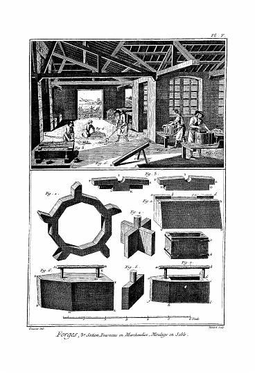 L'herminette à marteau a la tête d'un marteau d'un côté de l'oeil, et la planche ou herminette de l'autre. La planche est dans un plan perpendiculaire à l'oeil et au manche. Depuis l'oeil jusqu'au tranchant en biseau, elle Ve toujours en s'élargissant jusqu'à cinq ou six pouces ; son épaisseur est celle des coignées à épaule ou à touches. Elle se cintre un peu depuis l'oeil jusqu'au tranchant ; mais la courbure est plus considérable à environ six pouces du tranchant. La longueur du manche varie selon l'usage et la force de l'herminette. A celles des Charpentiers, il a dixhuit pouces de long ; des Déchireurs de bateau, environ trois pieds.